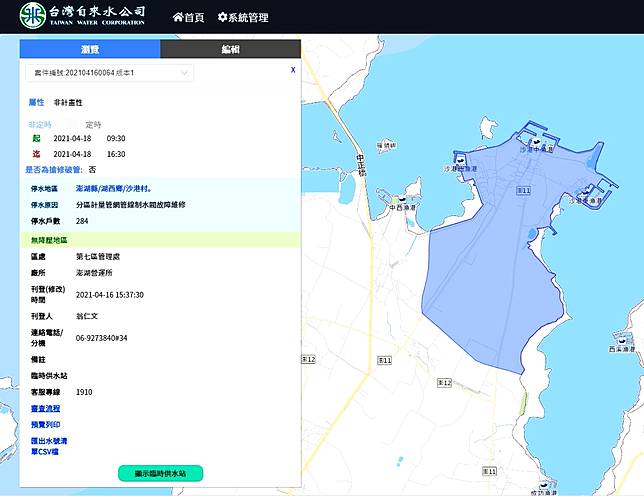 地址定位查詢: 請輸入完整地址(含台北市或新北市)查詢您的地址是否落於停水範圍內 資料來源:臺北自來水事業處 系統建罝:臺北自來水事業處 本站建議使用瀏覽器 ie11 以上版本瀏覽,瀏覽解析度 1024x768 以上 以上 生活 2021/04/19 20:43 高雄旗山、杉林區16里21日將停水 前鎮區7里22日停水 分享至 facebook另開新視窗 分享至 plurk另開新視窗 分享至 twitter另開新視窗 分享至 line另開新視窗 分享至 email另開新視窗 緊急通知單上會出現的「停水」的說法。這是口語上比較少用一點的。 water outage / cut / failure 那假如今天我們是跟隔壁鄰居聊到要停水這件事,就可以換個說法: the water got cut off.(停水了。) we're out of water.(我們沒有水了。 查詢停水資訊及定位 查詢地區和現正與即將實施的地點 藍色區塊 為停水範圍 綠色區塊 為降壓範圍 紅色區塊 為災害事件